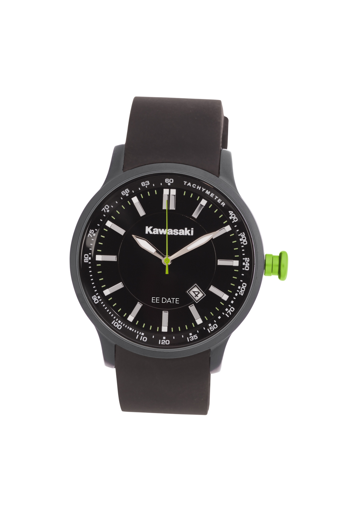 Questo orologio Kawasaki ha un design lineare. Il controllo dell’ora a colpo d’occhio è facilitato dalle lancette bianche che creano un forte contrasto con il quadrante nero. Le ore sono contrassegnate in grigio e bianco ed i minuti in verde così come la lancetta dei secondi ed il pulsante anodizzato di carica. Cinturino in silicone. Datario.