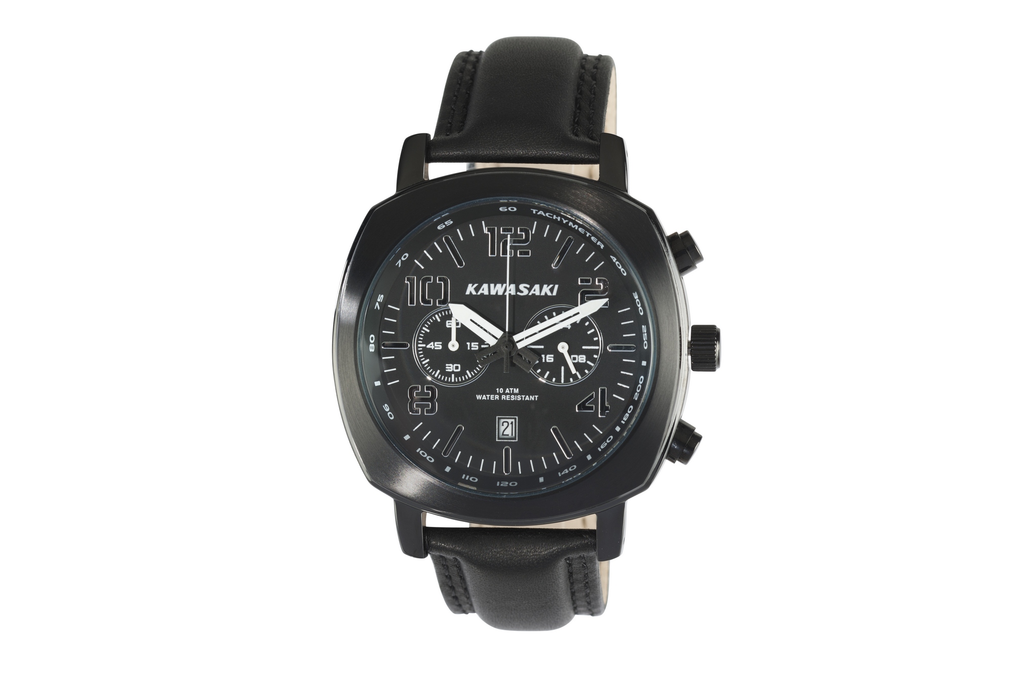Cronografo Kawasaki in stile retrò con cassa in acciaio impermeabile fino a 10ATM, dotato di quadrante nero su cui spiccano le lancette bianche ed il logo vintage Kawasaki. Il cinturino nero in pelle ed il datario completano questo esclusivo Kawasaki “time-keeping”.