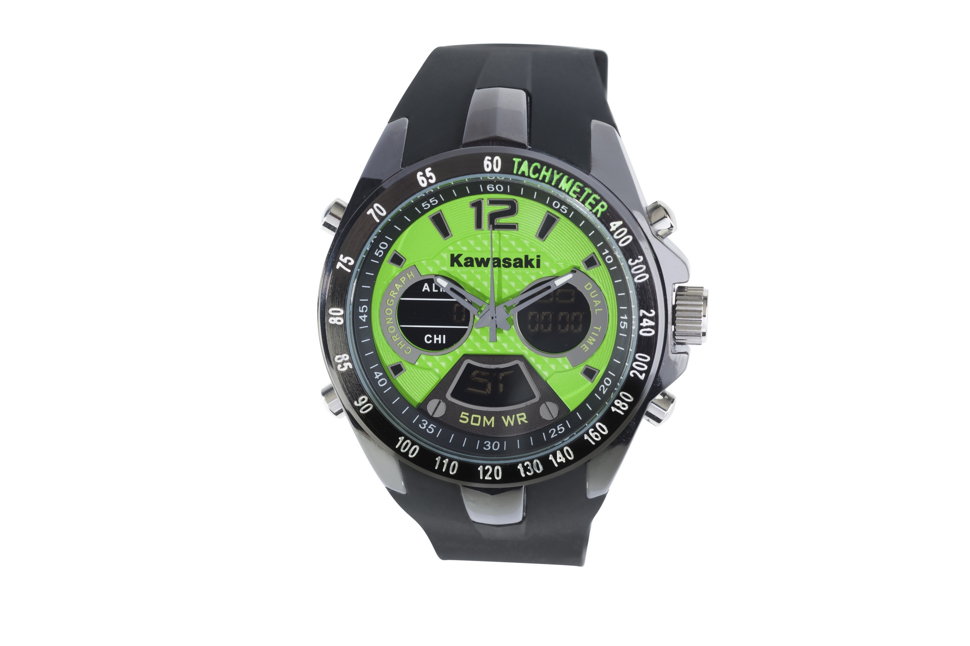 L’analogico incontra il digitale in questo nuovo orologio sportivo Kawasaki. La funzione allarme consente di non perdere mai un appuntamento mentre un cronometro digitale permette di rilevare i tempi. Quadrante in carbonio verde Kawasaki. Funzione dual-time. Cinturino in silicone. Impermeabile fino a 5 ATM. Datario.